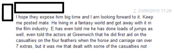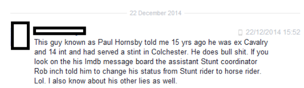What is proven is the Comments on Blogs and online interviews were never challenged or corrected by Paul Hornsby. He knew what was being said, He was tagged and in some cases liked the comments, yet let it run without correction. He could have quite easily corrected it. To end Bloating your service for personal gain is no excuse. He is disrespecting and insulting those he attempts to portray, he is also taking the film and tv world for a mug, advising on things he has no real world knowledge about…goggle must be his friend!