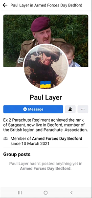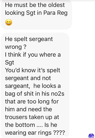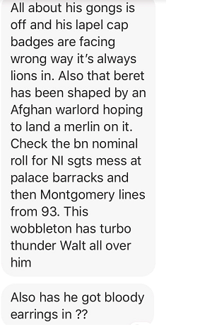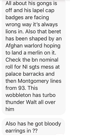 Layer pinged our radar a few months back after his mug shot and claims started doing the rounds around the Para Reg Facebook pages. He claims to be ex 2 Para, a Sgt and holder of the GC and what a rack he has.