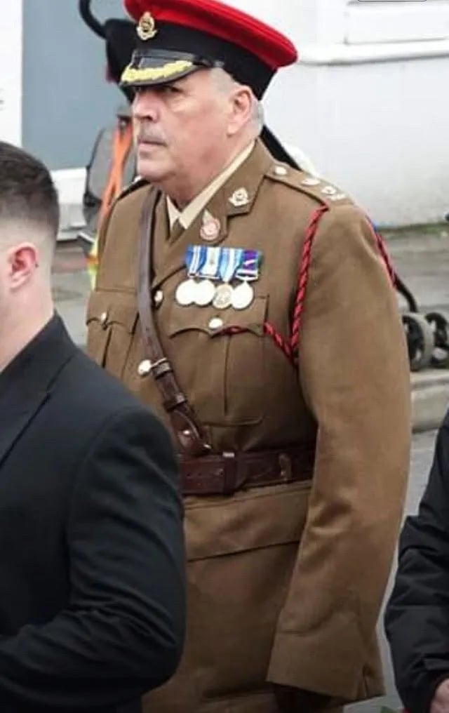 Sam Browne in shit order and interestingly he’s rocking a QGM, UN Cyprus, South Atlantic Medal and GSM with MiD Oakleaf. a bit of further Google digging unveiled his LinkedIn where he states he’s ex RMP SIB, an Honorary Lt Colonel and graduated from Sandhurst with a Bachelor of Law degree.