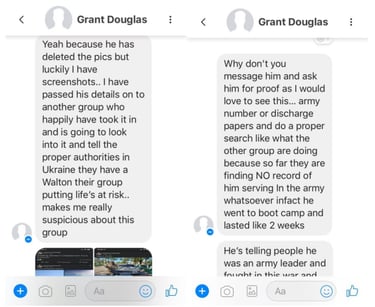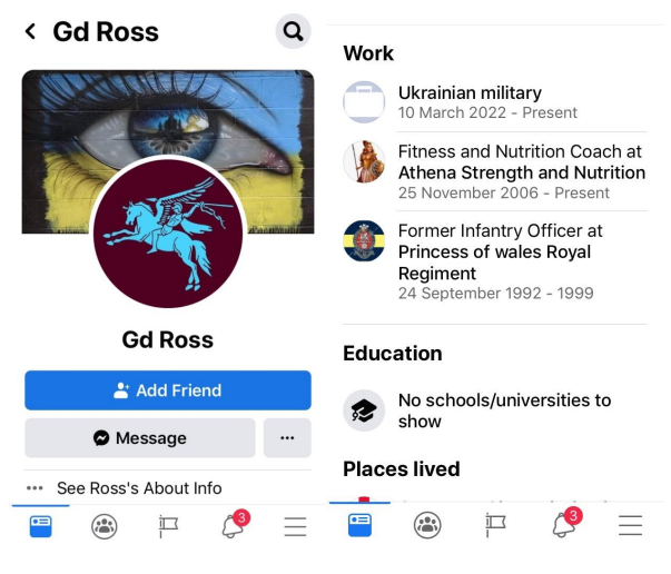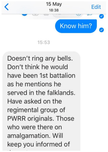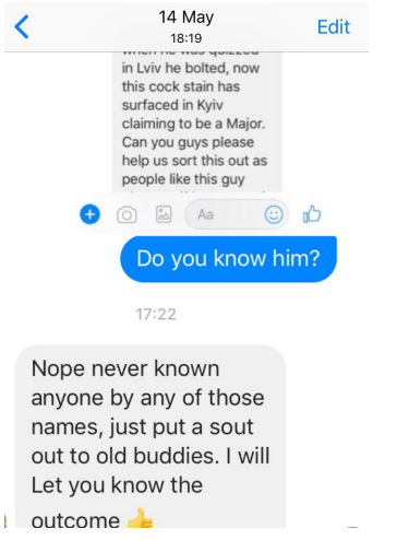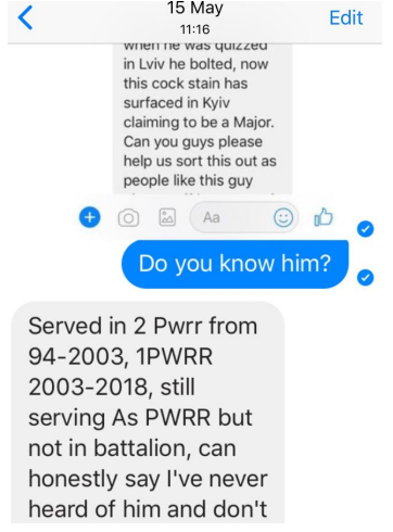 Hes telling everyone that he was an officer in the Prince of Wales Royal Regiment now he says he is a Lieutenant and when he was quizzed in Lviv he bolted, now this cock stain has surfaced in Kyiv claiming to be a Major. Can you guys please help us sort this out as people like this guy piss us off but most of all in the current climate people will believe him and follow him up the yellow brick road, we all know where that can lead?