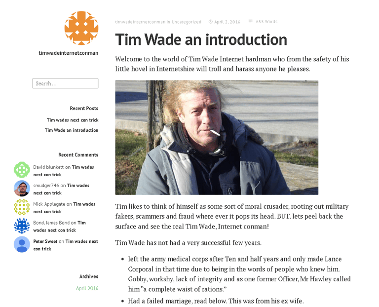 Then there is Tim Wade, or Wadey. Wade was once admin of the original WMHC Page set up last year (2012) after he was banned after throwing his dummy again from the original group ‘Walts People that Impersonate Real Armed Forces Veterans’ and who went out of his way to draw in hits towards his website.