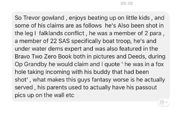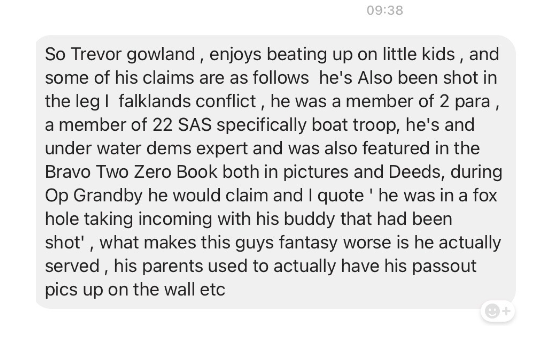 Our tip offs descriptions of Gowland's antics was one of Cumper style legends, with tales of being blown up in the Falklands, and Secret operations in Iraq and Afghanistan.